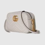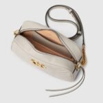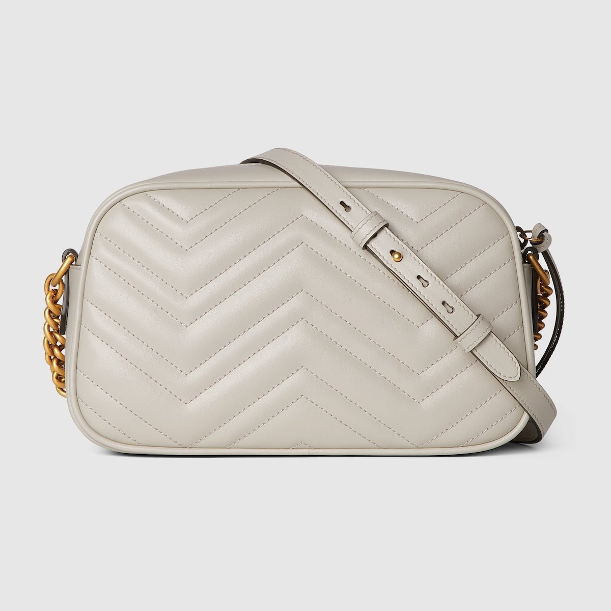 Made in matelass?? chevron leather in a neutral shade of light grey, the now recognisable GG Marmont small shoulder bag has a softly structured shape and a flap closure with Double G hardware.