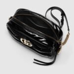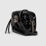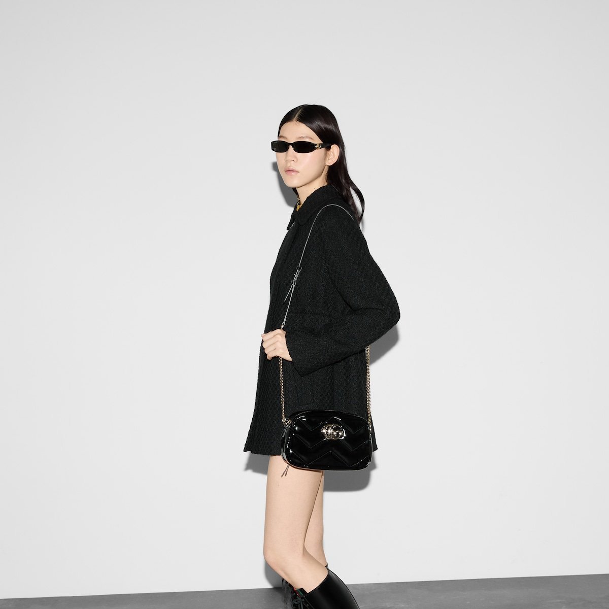The GG Marmont collection spotlights sophisticated leather in dark tones to welcome Pre-Fall. Crafted in quilted chevron patent leather, this small shoulder bag with a zip closure underlines its contemporary silhouette in black, complete with light gold toned hardware.