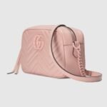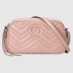 With its recognisable matelass?? fabric and Double G hardware, the GG Marmont has become synonymous with the House. Continuously reinvented through the seasons, signature shapes are introduced in new colourways to match Gucci’s contemporary vision. This light pink small shoulder bag reveals a chevron base, further enhancing the tonal logo hardware.