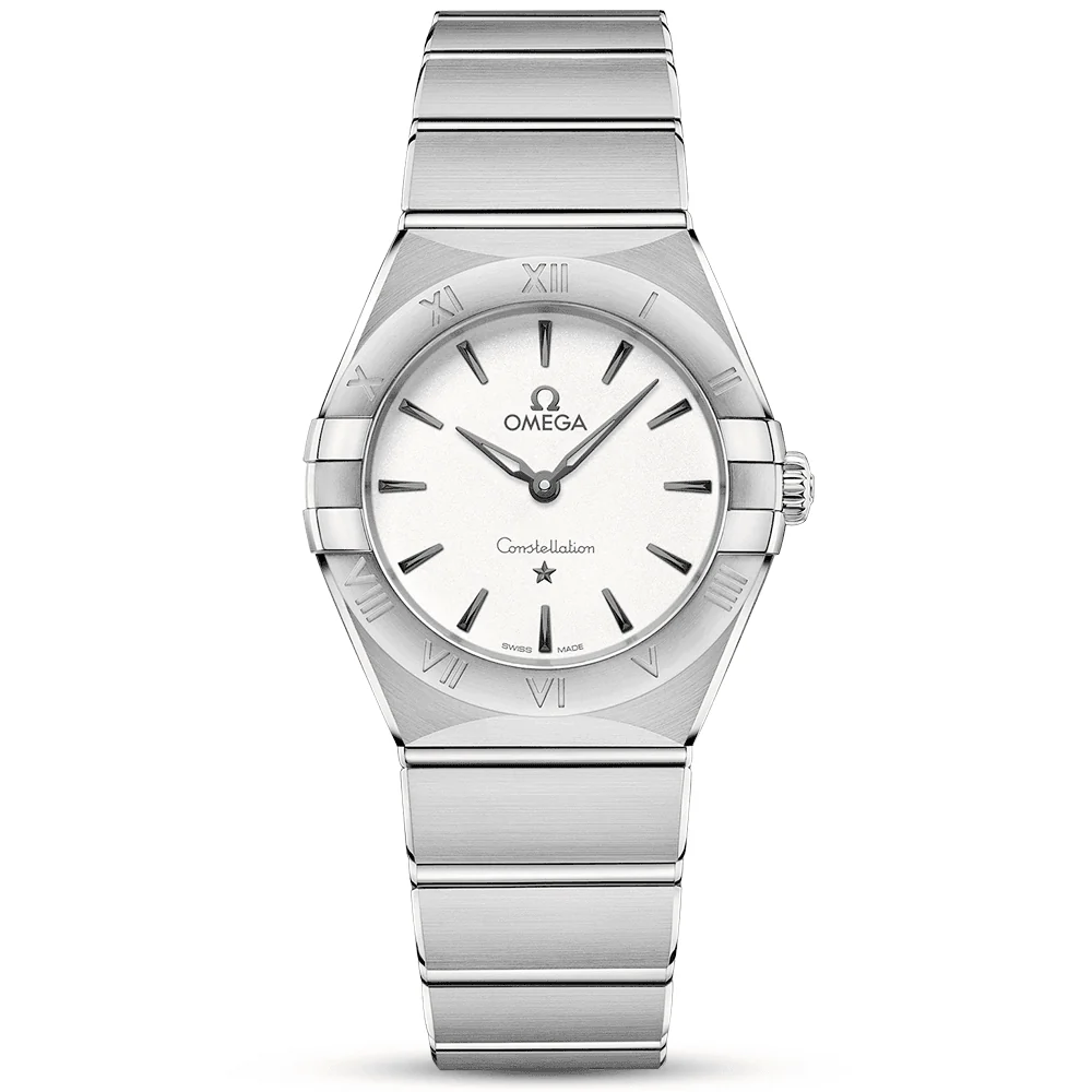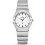 Embellished in scintillating diamonds, this stunning Constellation watch from Omega is tailored to suit the needs and desires of those ladies with a preference for the finer things in life. The luxury women’s watch is crafted from stainless steel and 18ct Sedna gold. The rose gold tones of this material are used in the diamond-set bezel, together with the famous claws, the crown and the bezel. The Omega Constellation watch Features a mother of pearl dial with diamond dot hour markers, Sedna gold hands with a luminous coating, and a date aperture at 6 o’clock. The Omega Constellation watch measures 29mm and has been integrated with 50-meter water resistance. It is powered by the Co-Axial Master Chronometer Calibre 8700, which produces a 50-hour power reserve. The movement puts its rhodium-plated finishes and Geneva waves in arabesque on show through a sapphire crystal glass exhibition caseback. To complete its timeless look, the Omega Constellation watch for women wraps around the wrist with a stainless steel and 18ct Sedna gold mono-rang bracelet, securing with a folding clasp.