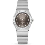 OMEGA Constellation Manhattan 28mm Green Diamond Dial Ladies Bracelet Watch131.10.28.60.60.001. Stainless steel 28mm case and bezel with matcha green roman hour numerals all on a matching stainless steel bracelet. This ladies watch has a matcha green sunray dial with polished hands and 12 diamond set hour indexes. Sapphire crystal glass and water resistant up to 30m. Quartz movement.