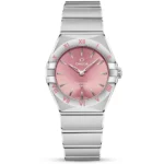 OMEGA Constellation Manhattan 28mm Purple Diamond Dial Ladies Bracelet Watch 131.10.28.60.60.002. Stainless steel 28mm case and bezel with purple roman hour numerals all on a matching stainless steel bracelet. This ladies watch has a patchouli blossom sunray dial with polished hands and 12 diamond set hour indexes. Sapphire crystal glass and water resistant up to 30m. Quartz movement.