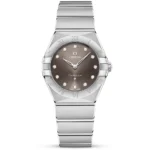 This 28mm lady’s Omega Constellation watch belongs to one of the manufacturer’s most iconic collections. Characterised by its instantly recognisable griffes or “claws” upon its bezel and its distinctive mono rang bracelet, the design of the Constellation creates a statement on the wrist. This stainless steel model is 30-meter water resistant and Features a bezel engraved with traditional Roman numerals. The bezel surrounds a cream silvery dial adorned with 18ct Sedna gold hands that taper to a point, the famous Constellation star and 12 settings for each round brilliant-cut diamond. Inside the case of this Omega Constellation watch is a reliable Swiss-made quartz movement. Its striking steel on steel design will complement smart, professional or formal attire effortlessly, securing to the wrist with a stainless steel bracelet and locking into place with a clasp that has been engraved with the iconic Omega logo.