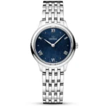 Renowned for its enduring style and charm the Omega De Ville Prestige watch collection is home to a range of timepieces offered in various colours and styles. This lady’s model is powered by a quartz movement with an improved battery life and is crafted from stainless steel. The design blends the traditional with the modern in this timeless design, perfect for all occasions. It measures a diameter of 27.5mm and is equipped with 30-meter water resistance. Rhodium-plated hands travel over a PVD pine green dial featuring a sun-brushed finish. An hour track surrounding these hands is characterised by a mix of cabochons and traditional Roman numerals – also executed in the same rhodium plating. The Omega lettering and logo stand proud at 12 o’clock, protected underneath a piece of anti-reflective and scratch-resistant sapphire crystal glass. This lady’s Omega De Ville Prestige watch wraps effortlessly around the wrist with a stainless steel bracelet with a folding clasp that is engraved with the iconic brand logo.