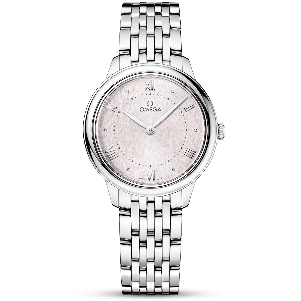 Renowned for its enduring style and charm the Omega De Ville Prestige watch collection is home to a range of timepieces offered in various colours and styles. This lady’s model is powered by a quartz movement with an improved battery life and is crafted from stainless steel. The movement sits behind a specially embossed caseback depicting a God Chronos medallion. The design blends the traditional with the modern in this timeless design, perfect for all occasions. It measures a diameter of 30mm and is equipped with 30-meter water resistance. Rhodium-plated hands travel over a PVD pine green dial featuring a stamped random vertical pattern in a sun-brushed finish. An hour track surrounding these hands is characterised by a mix of cabochons and traditional Roman numerals – also executed in the same rhodium plating. The Omega lettering and logo stand proud at 12 o’clock, protected underneath a piece of anti-reflective and scratch-resistant sapphire crystal glass. This lady’s Omega De Ville Prestige watch wraps effortlessly around the wrist with a stainless steel bracelet with a folding clasp that is engraved with the iconic brand logo.