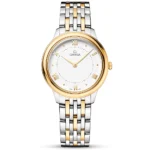 OMEGADe Ville Prestige 30mm Two-Tone White Mother of Pearl Dial Bracelet Watch 434.20.30.60.05.001. Stainless steel & 18ct rose gold 30mm case and bezel all on a matching steel & 18ct rose gold bracelet. This ladies watch has a white mother of pearl dial with rose golden hands and hour markers. Sapphire crystal glass and water resistant up to 30m. Quartz movement.