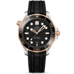 OMEGA Seamaster Diver 300m 42mm Black Dial & 18ct Yellow Gold Men’s Watch 21022422001001. Stainless steel & 18ct yellow gold 42mm case and black ceramic bezel all on a black rubber strap. This men’s watch has a black laser-engraved dial with luminous applied hands and hour markers, date display at the 6 o’clock position. Water resistant up to 300m and sapphire crystal glass. Automatic movement.