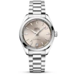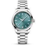 This stunning lady’s Omega Seamaster Aqua Terra watch is a superior dive watch for women and presents the time on a feminine and remarkably attractive lavender purple dial fashioned from brass. The display is then set with rhodium-plated indexes and hands that have been coated with a layer of Super-LumiNova for telling the time in dark conditions. This lady’s Omega Seamaster watch is a steel-on-steel design that measures a 34mm diameter. Its top is sealed with a pane of anti-reflective and scratch-resistant sapphire crystal glass. The same tough material is also used on the back of the case, showcasing an in-house co-axial master chronometer as it performs. The Calibre 8800 beats at a rhythm of 28,800 vibrations per hour and provides a power reserve of 55 hours once fully wound. This women’s Omega Seamaster Aqua Terra watch also Features a screw-down crown, the Omega logo etched into the surface of the dial at 12 o’clock, a date window at 6 o’clock, a 150-meter water resistance and a stainless steel bracelet with rounded links executed in a mix of brushed and polished surfaces.