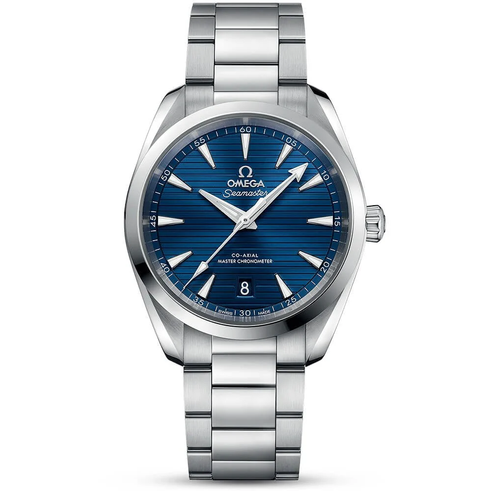 OMEGA Seamaster Aqua Terra 38mm Summer Blue Dial Automatic Bracelet Watch 220.10.38.20.03.004. Stainless steel 38mm case and bezel all on a matching stainless steel bracelet. This watch has a PVD-treated summer blue gradient dial with polished & luminous applied hands and hour markers as well as a date display at the 6 o’clock position. Water resistant up to 150m and sapphire crystal glass. 60 hour power reserve. OMEGA Calibre 8800 METAS approved automatic movement.