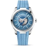 OMEGA Seamaster Aqua Terra GMT Worldtimer 43mm Titanium Black Dial Strap Watch 220.92.43.22.99.001. Titanium 43mm case and black ceramic bezel all on a black structured rubber strap. This men’s watch has a sun-brushed black dial with blackened & luminous applied hands and hour markers as well as a date display at the 6 o’clock position & GMT function set around the dial. Water resistant up to 150m and sapphire crystal glass. 60 hour power reserve. OMEGA Calibre 8938 METAS approved automatic movement.