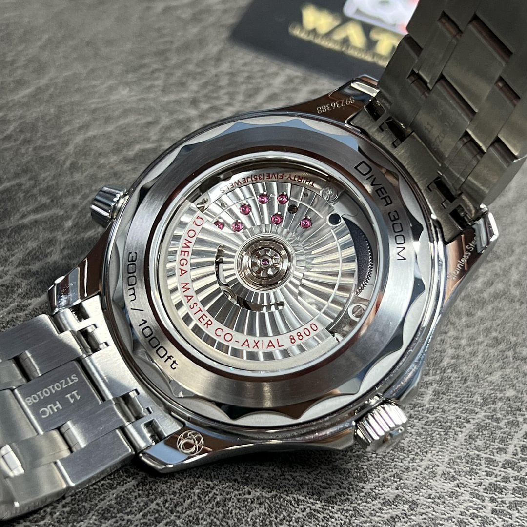 Having enjoyed a legendary following on the wrists of professional divers and devoted Omega watch fans, this robust diving tool – the Omega Seamaster Professional Diver 300M – is ready for demanding underwater exploration and comes in a 42mm stainless steel case. As its name suggests, the men’s Seamaster watch is equipped with 300-meter water resistance and is topped with a strong domed anti reflective sapphire crystal glass front, which protects a polished black ceramic dial from dust, dents, scratching, water, heat and light damage. The surface of the dial is also executed with a brushed and polished laser-ablated wave-effect pattern, creating a sense of depth against a set of luminous coated central hands. The hour track, represented in circular and rectangular-shaped indexes has also received a generous helping of luminous material, guiding the wearer to precision timekeeping during the night. Powering the hands of this Seamaster Diver 300M watch is the Omega Master Chronometer Calibre 8800, which provides a 55-hour power reserve. The self-winding engine is also resistant to magnetic fields up to 15,000 gauss. The movement is put on display behind a sapphire-backed case and also provides a date aperture at 6 o’clock. Securing comfortably to the wrist of the diver, this men’s 42mm steel Omega Seamaster Diver 300M watch is completed on a stainless steel bracelet with polished and brushed links and a folding clasp engraved with the iconic Omega logo.
