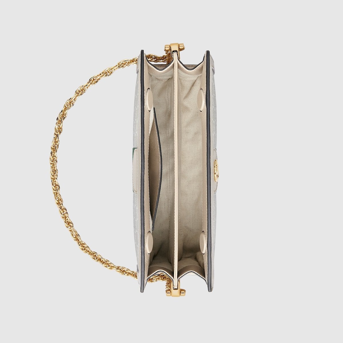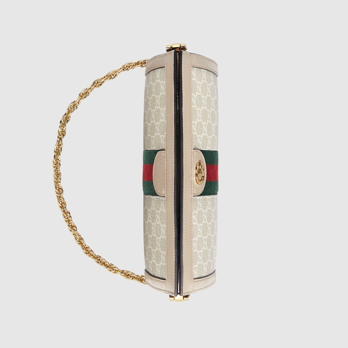 A heritage material from the archive, GG Supreme has been reimagined in Gucci Love Parade in different color combinations and combined with contemporary as well as classic styles. The Ophidia shoulder bag is presented in a beige and white variation of the signature material with a tonal trim. Originally a play on a ’30s design, the canvas speaks to the historical narrative that runs throughout the collection.