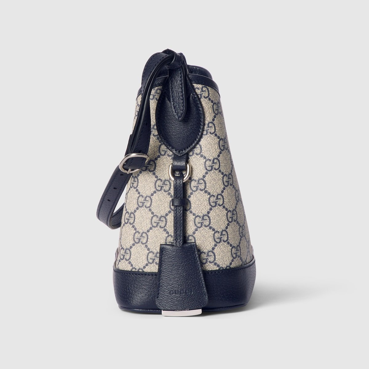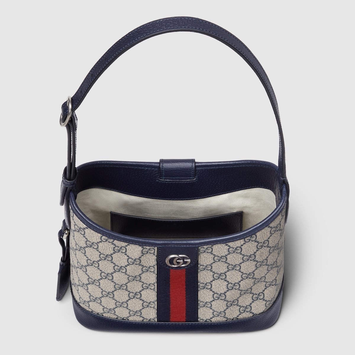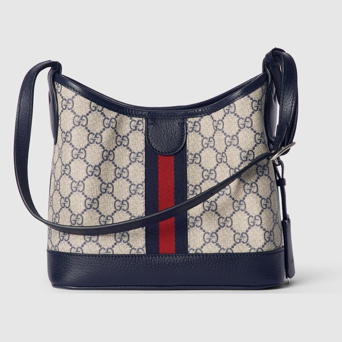 The Ophidia is reinvented in new and unexpected ways in this small-sized piece, which blends the open bucket design and shoulder bag style. It is crafted in the House’s signature GG Supreme canvas in the color combination of beige and blue.