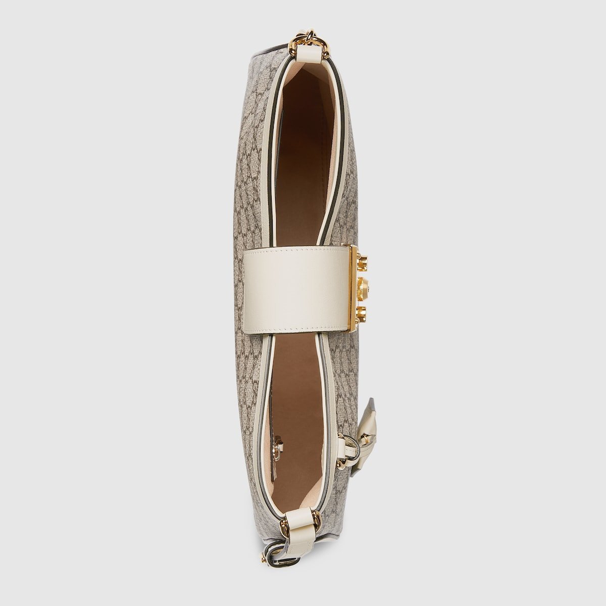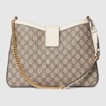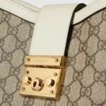 Drawing from the House’s origins as an artisanal luggage atelier, the Padlock closure features prominently on this shoulder bag in GG Supreme canvas. It is complete with gold-toned hardware, smooth white leather trim, a chain and leather shoulder strap.