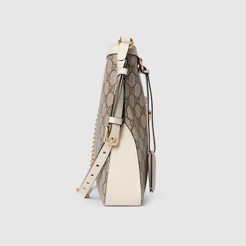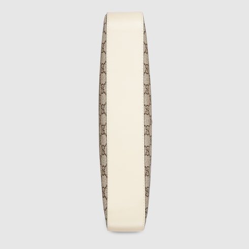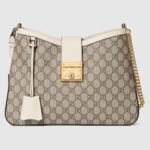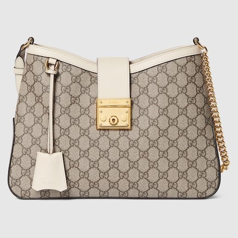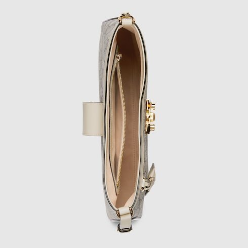 Drawing from the House’s origins as an artisanal luggage atelier, the Padlock closure features prominently on this shoulder bag in GG Supreme canvas. It is complete with gold-toned hardware, smooth white leather trim, a chain and leather shoulder strap.