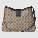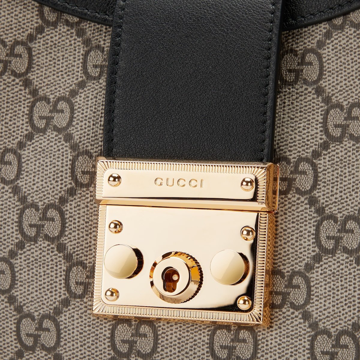 Drawing from the House’s origins as an artisanal luggage atelier, the Padlock closure features prominently on this shoulder bag in GG Supreme canvas. It is complete with gold-toned hardware, smooth black leather trim, a chain and leather shoulder strap.