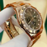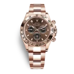 THIS OYSTER PERPETUAL COSMOGRAPH DAYTONA IN 18 CT EVEROSE GOLD, WITH A CHOCOLATE AND BLACK DIAL AND AN OYSTER BRACELET, FEATURES AN 18 CT EVEROSE GOLD BEZEL WITH ENGRAVED TACHYMETRIC SCALE.
