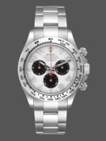 Rolex Cosmograph Daytona 116509 White Mother of Pearl Dial 40MM Mens Replica Watch has a White Gold 40 mm Round Case with Screw Down Crown and a White Gold.White Mother of Pearl dial with 8 applied diamond hour markers, 3 white gold rimmed mother of pearl subdials, 12-hour chronograph, sapphire crystal,The elegantly designed White Gold with Folding Oysterlock Safety will look great on your wrist.