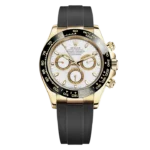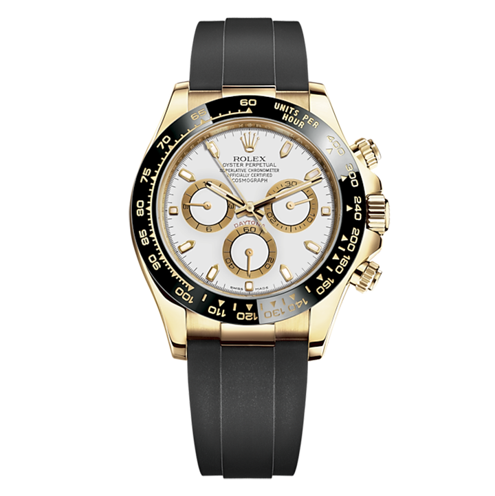 THIS OYSTER PERPETUAL COSMOGRAPH DAYTONA IN 18 CT YELLOW GOLD WITH A WHITE DIAL AND AN OYSTERFLEX BRACELET, FEATURES A BLACK CERACHROM BEZEL WITH TACHYMETRIC SCALE.
