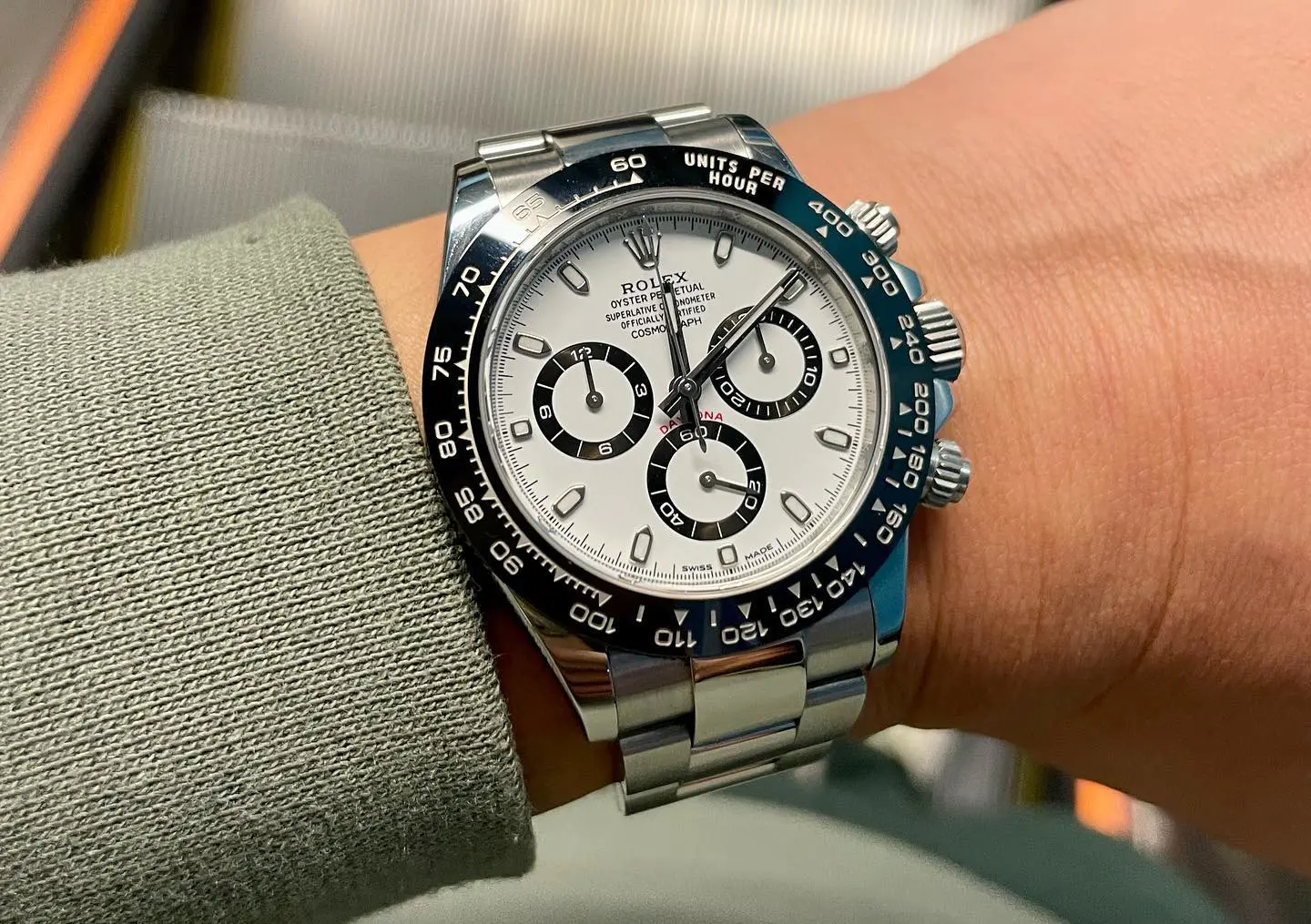 BEZEL MATERIAL: Monobloc Cerachrom showing Tachymeter Markings