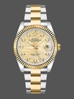 Rolex Datejust 126233 Champagne Motif dial Fluted Bezel 36MM Unisex Replica Watch , 36mm yellow Rolesor case with Oystersteel monobloc middle case, screw-down steel back, screw-down yellow crown, yellow fluted bezel, The golden dial has a fluted-motif, index hour markers,Date displayed under cyclops lens in window at 3 o’clock with instantaneous date and rapid setting.Yellow Rolesor Jubilee bracelet with five-piece links, folding Oysterclasp buckle with Easylink comfort extension link.