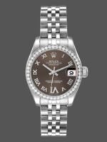 Rolex Datejust 178384 Stainless Steel Black Sunburst dial 31MM Lady Replica Watch,has a White Gold 31 mm Round Case with Screw Down Crown,White Gold bezel with set diamonds.Black sunburst dial with silver-tone hands and Roman numeral hour markers.Date calendar at 3 o’clock aperture. Stainless steel jubilee bracelet with fold over clasp.