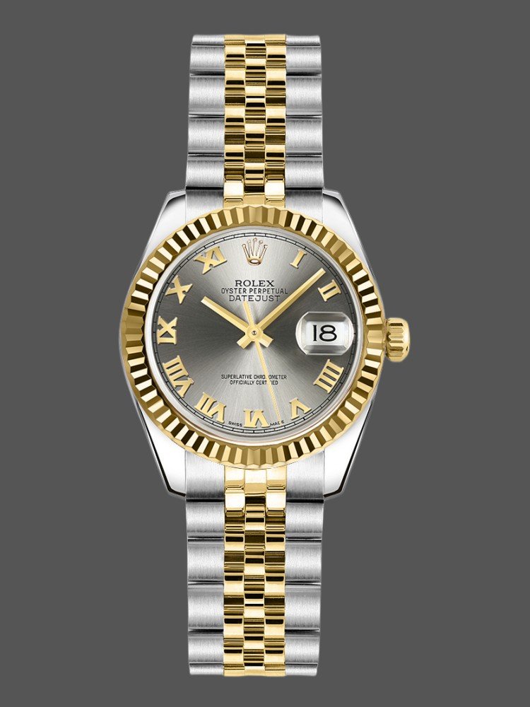 Rolex Datejust 179173 Gray Diamond Dial Fluted Bezel 26MM Lady Replica Watch,Stainless steel oyster case 26.0 mm in diameter.Yellow gold fluted bezel. Scratch resistant sapphire crystal with cyclops magnifier.Gray Diamond Dial with Diamond Hour Markers.Date calendar at 3 o’clock aperture. Stainless steel yellow gold jubilee bracelet with a hidden clasp.