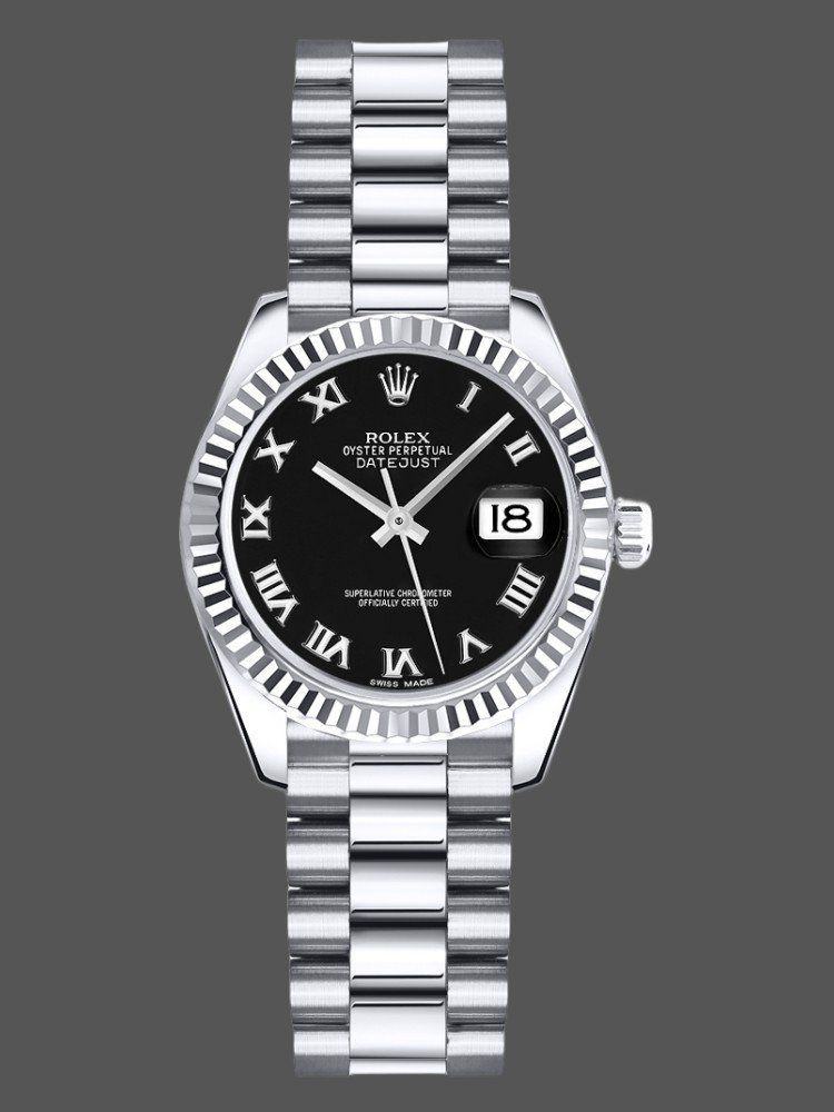 Rolex Datejust 179179 Mother of Pearl Dial Fluted Bezel 26MM Lady Replica Watch,26mm white gold oyster case in diameter. White gold fluted bezel. Scratch resistant sapphire crystal with cyclops magnifier. Mother of Pearl dial with diamond hour markers. Date calendar at 3 o’clock aperture. White gold president bracelet with hidden clasp.