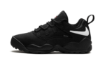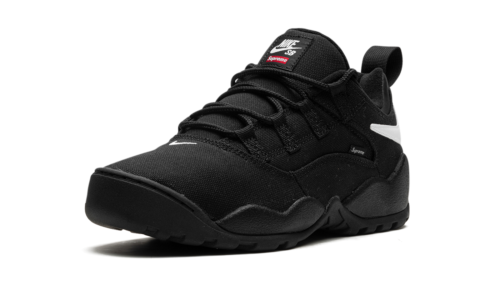 The Supreme x Nike SB Darwin Low “Black” is a collaboration by the “World Famous” streetwear brand on a versatile colorway of the retro skate and basketball shoe. The Nike Darwin was designed by legendary Nike footwear designer Tinker Hatfield and worn by Dennis Rodman in the NBA before it became indoctrinated into the skateboarding world thereafter. Supreme and Nike SB team up to bring back the classic 1990s-era shoe with skate-friendly updates. The “Black” colorway features a black canvas construction with a white reversed Swoosh on the collar. A “Supreme” branded tag is seen on the lateral side of the shoe. Co-branding appears on the tongue.