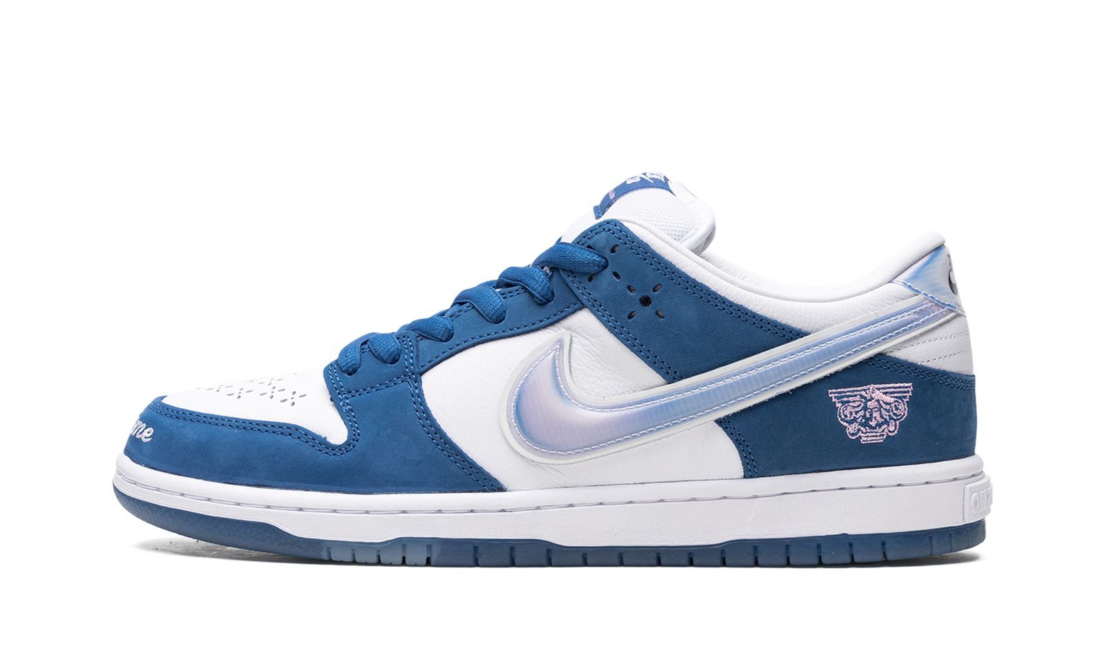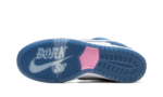 The Born x Raised x Nike SB Dunk Low “One Block at a Time” is the first-ever collaboration between the California-based streetwear brand and Nike SB on the iconic skate shoe. The “One Block at a Time” SB Dunk by Born x Raised features a decidedly “Los Angeles” look, as the shoe’s white and blue color block is undoubtedly inspired by the Los Angeles Dodgers’ team uniforms. The shoe features a white leather base with blue nubuck overlays and unique perforations on the toe. “One Block at a Time” is embroidered on the front of the toe cap across both shoes. A pink branding emblem appears on the lateral side of the heel. The side Swooshes are featured in an iridescent material with a puffed effect. The shoe is mounted on a white rubber midsole. A “Born SB” graphic is found underneath the clear rubber outsole. Release date: June 1, 2023