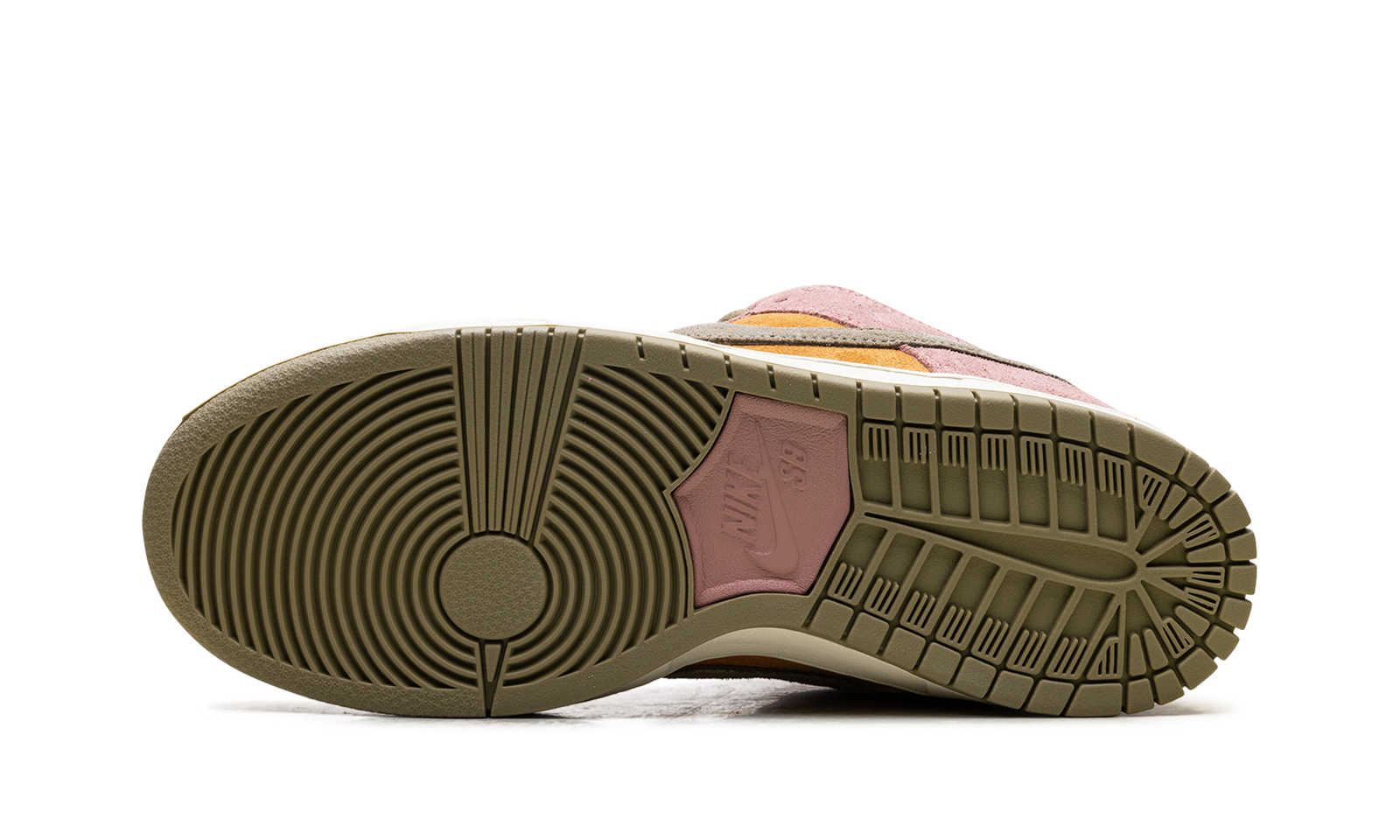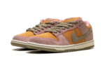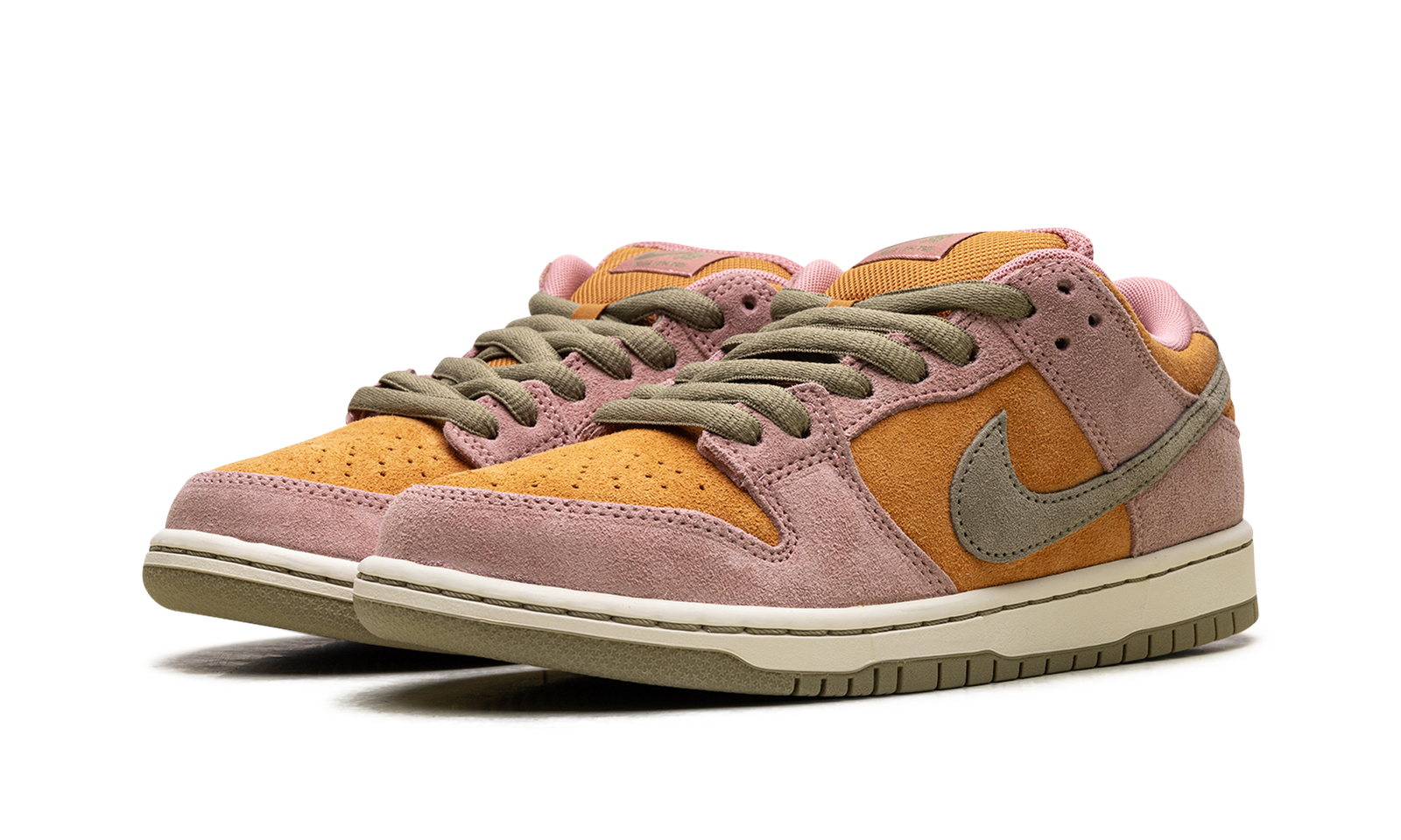 The Nike Dunk Low SB ‘Red Stardust’ (HJ4135 600) has a muted orange suede upper with contrasting pink overlays and a light olive Swoosh. The Nike SB logo decorates the tongue tag and insoles, equipped with a Zoom Air heel unit.