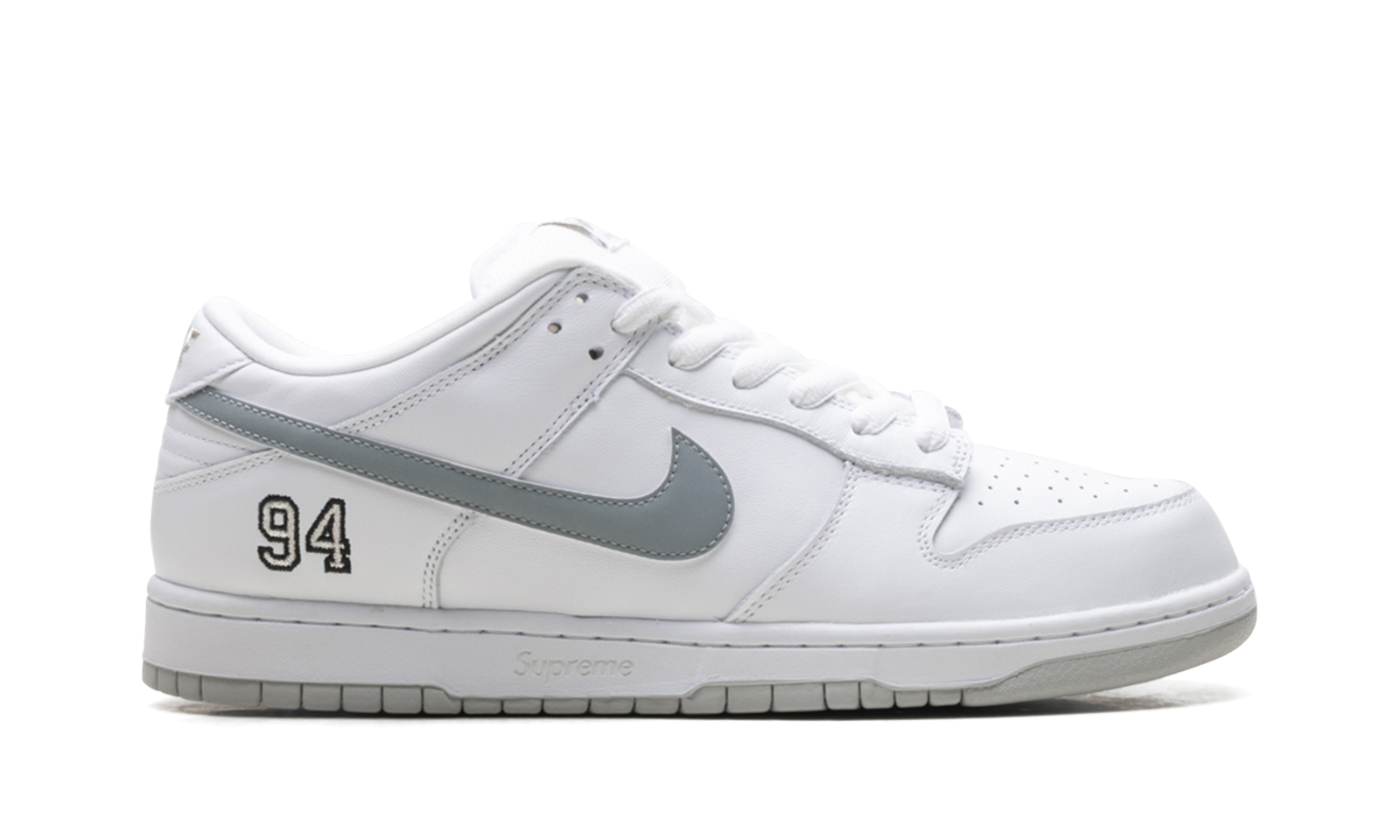 The Supreme x Nike SB Dunk Low “White” is one of five colorways that the streetwear brand released in spring 2025. Anytime Supreme releases a Dunk, it’s a big deal, and this 2025 collaboration is no exception. The “White” colorway of the Supreme Dunk features a smooth white upper that is accented with a reflective silver Swoosh that adds contrast. The number “94” is embroidered by the heel in a style that is reminiscent of Michael Jordan’s “23” that appears on certain Air Jordan 5 models. The “94” is a nod to the year Supreme opened, and the brand’s logo is also debossed on the midsole.