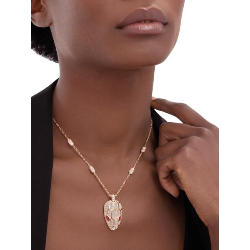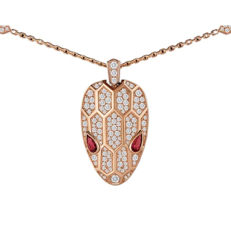 Inspired by the metamorphosis of the mysterious snake that sheds its skin to transform and regain its strength, the iconic Serpenti collection has been a fitting symbol of endless change since 1948. The Serpenti 18K rose gold pendant necklace, meticulously inlaid with sparkling pavé diamonds and red tourmaline eyes, cleverly combines superior craftsmanship with an extraordinary wearing experience, showing an irresistible charm and timeless beauty. A source of strength and confidence, always advancing with the times.
