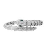 The Serpenti bracelet is a fascinating and enchanting sight, with its enchanting eyes. This elegant jewel lingers on your finger, its beautiful scales gleaming with a moving light, reflecting the unique sinuousness of the snake. The snake’s gaze is further enhanced by the Bvlgari logo: two stunning colored gemstones that are irresistible. Serpenti bracelet in 18K white gold with pave diamonds and emerald eyes