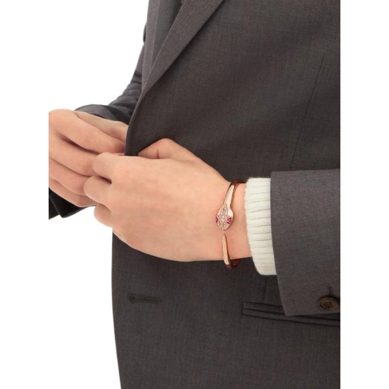 Inspired by the metamorphosis of the mysterious snake that sheds its skin to transform and regain its strength, the iconic Serpenti collection has been a fitting symbol of endless change since 1948. The Serpenti bracelet in 18K rose gold, meticulously inlaid with sparkling pave diamonds and red tourmaline eyes, cleverly combines superior craftsmanship with an extraordinary wearing experience, showing an irresistible charm and timeless beauty. A source of strength and confidence, always advancing with the times.