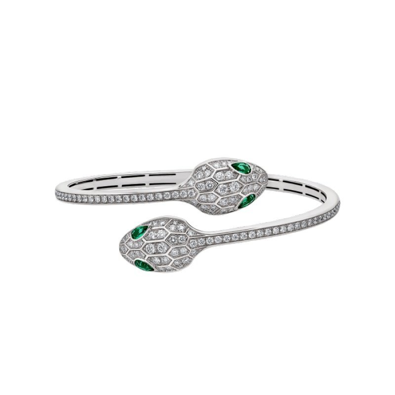 Inspired by the metamorphosis of the mythical snake, which sheds its skin to transform and regain its strength, Bulgari??s iconic Serpenti collection has been a fitting symbol of endless change since 1948. The Serpenti bracelet in white 18K gold, carefully inlaid with sparkling pave diamonds and emerald snake eyes, cleverly combines superior craftsmanship with an extraordinary wearing experience, showing an irresistible charm and timeless beauty. As an inexhaustible source of strength and confidence, it always keeps pace with the times.