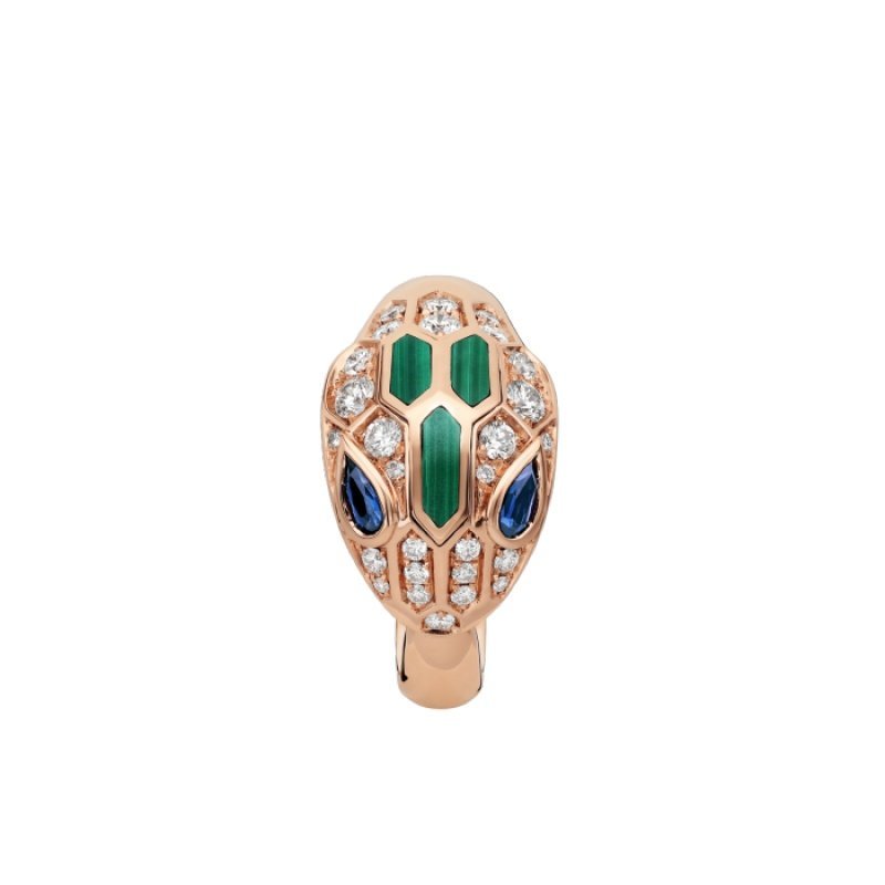 Inspired by the transformational qualities of the mythical snake that sheds its skin to change and regain its strength, Bulgari??s iconic Serpenti collection has been a fitting symbol of endless change since 1948. The Serpenti ring in 18K rose gold is inlaid with sparkling pave diamonds, blue sapphire snake eyes and malachite elements, ingeniously combining superior craftsmanship with an extraordinary wearing experience, showing an irresistible charm and timeless beauty. As an inexhaustible source of strength and confidence, it always keeps pace with the times.
