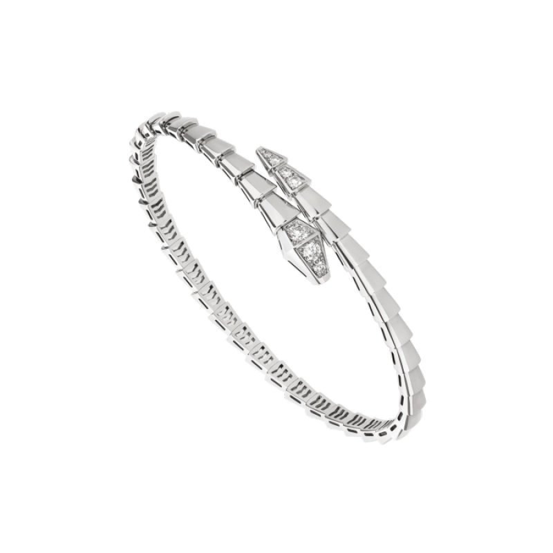 The Serpenti Viper bracelet in 18K white gold and semi-pave diamonds is a signature combination of pure beauty, circumferential shapes and allure, a simple and concise interpretation of the endless transformation of Bvlgari’s classics. This glamorous jewelry piece embodies the powerful characteristics of the mysterious snake’s constant transformation, inspiring people to actively seek change and regard it as an inexhaustible source of strength and confidence. It is suitable for mixing and matching, providing a variety of styling options, showing the flexible and versatile style of the series.