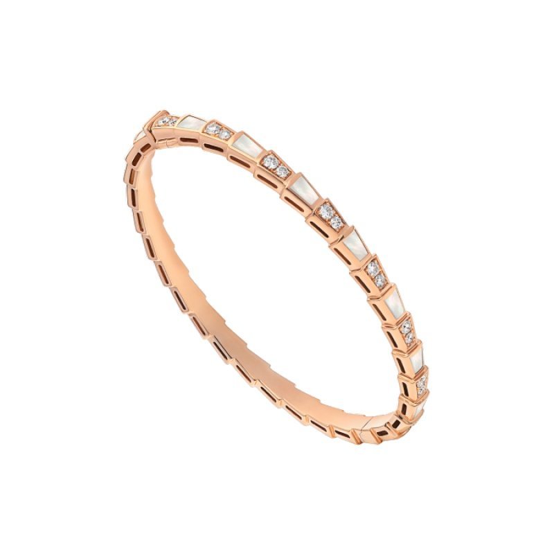 The Serpenti Viper bracelet in 18K rose gold, adorned with pave diamonds and white mother-of-pearl, is a signature style that cleverly combines pure aesthetics, enveloping shapes and charming charm, and simply interprets the endless transformation and evolution of Bulgari’s classic works. This charming jewelry piece embodies the powerful characteristics of the mysterious snake’s continuous transformation, inspiring people to actively seek change and regard it as an inexhaustible source of strength and confidence. It is suitable for mixing and matching at will, providing a variety of styling options, showing the flexible and versatile style of the series.