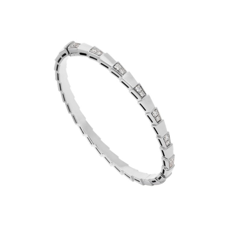 Reminiscent of a snake coiling before it strikes, this bracelet sensually wraps around the wrist, letting you indulge in its seductive curves. This sophisticated and fashionable piece of jewellery cleverly combines the deadly and fascinating nature of scales with the winding posture of the snake. Under the seductive design, sensuality and charm are intoxicating. Light and shadow, intellect and desire, the two sides of the snake’s nature are fully revealed. Serpenti Viper series white gold 18K diamond bracelet decorated with semi-pave. (thickness 4 mm)