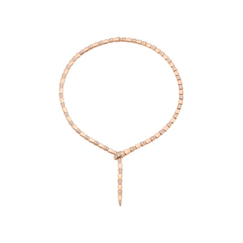 The Serpenti Viper necklace in 18K rose gold, decorated with semi-pavé diamonds, cleverly combines pure aesthetics, encircling shapes and charming charm in an iconic style, and simply interprets the endless transformation and evolution of Bvlgari’s classic works. This charming jewelry piece embodies the powerful characteristics of the mysterious snake’s continuous transformation, inspiring people to actively seek change and regard it as an inexhaustible source of strength and confidence. It is suitable for mixing and matching at will, providing a variety of styling options, showing the flexible and versatile style of the series.