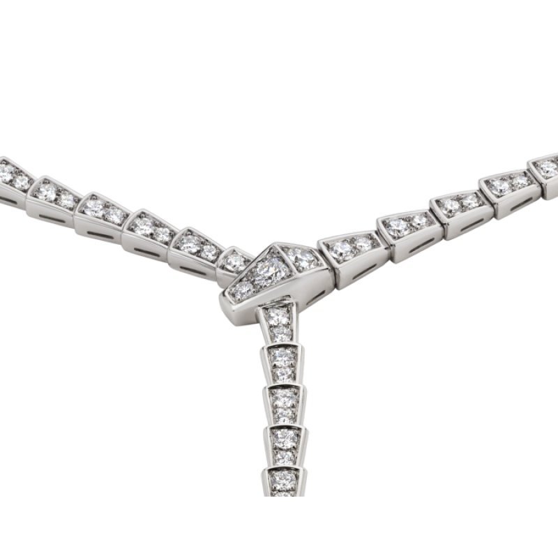 Bvlgari pays tribute to its animal by capturing the allure, seduction and charming sensuality of the Serpenti Viper necklace in a mesmerizing design. This jewel of elegance lingers around the neck, its beautiful scales gleaming with the ultimate in light, capturing the unique curves of the snake. Serpenti Viper thin necklace in 18K white gold, fully pavé diamonds.