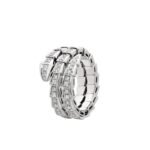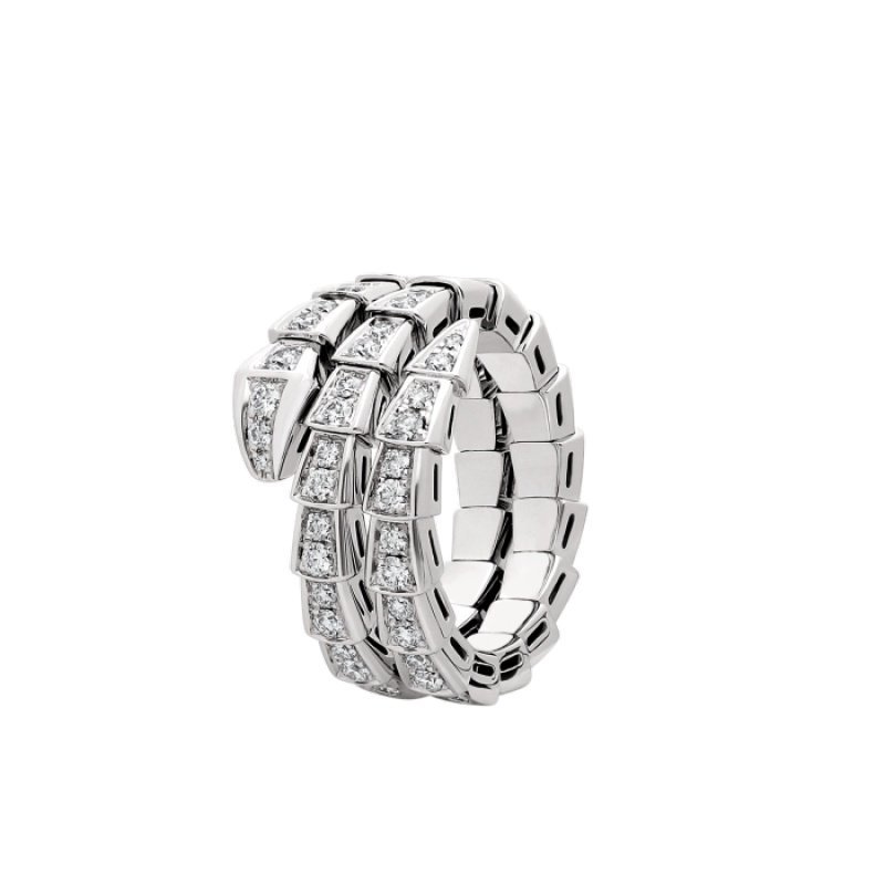 The Serpenti Viper ring in 18K white gold, fully pave-set with diamonds, is a signature style that combines pure beauty, circumferential shapes and allure, a simple and concise interpretation of the endless transformation and evolution of Bulgari’s classic creations. This glamorous jewelry piece embodies the powerful characteristics of the mysterious snake’s constant transformation, inspiring people to actively seek change and regard it as an inexhaustible source of strength and confidence. It is suitable for mixing and matching at will, providing a variety of styling options, showing the flexible and versatile style of the series.