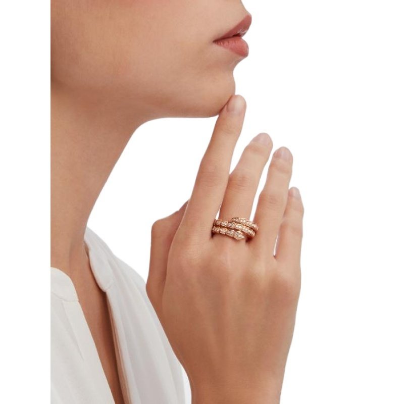 The Serpenti Viper ring in 18K rose gold, fully pave-set diamonds, is a signature style that combines pure beauty, circumferential shapes and allure, a simple and concise interpretation of the endless transformation and evolution of Bulgari’s classic creations. This glamorous jewelry piece embodies the powerful characteristics of the mysterious snake’s constant transformation, inspiring people to actively seek change and regard it as an inexhaustible source of strength and confidence. It is suitable for mixing and matching at will, providing a variety of styling options, showing the flexible and versatile style of the series.