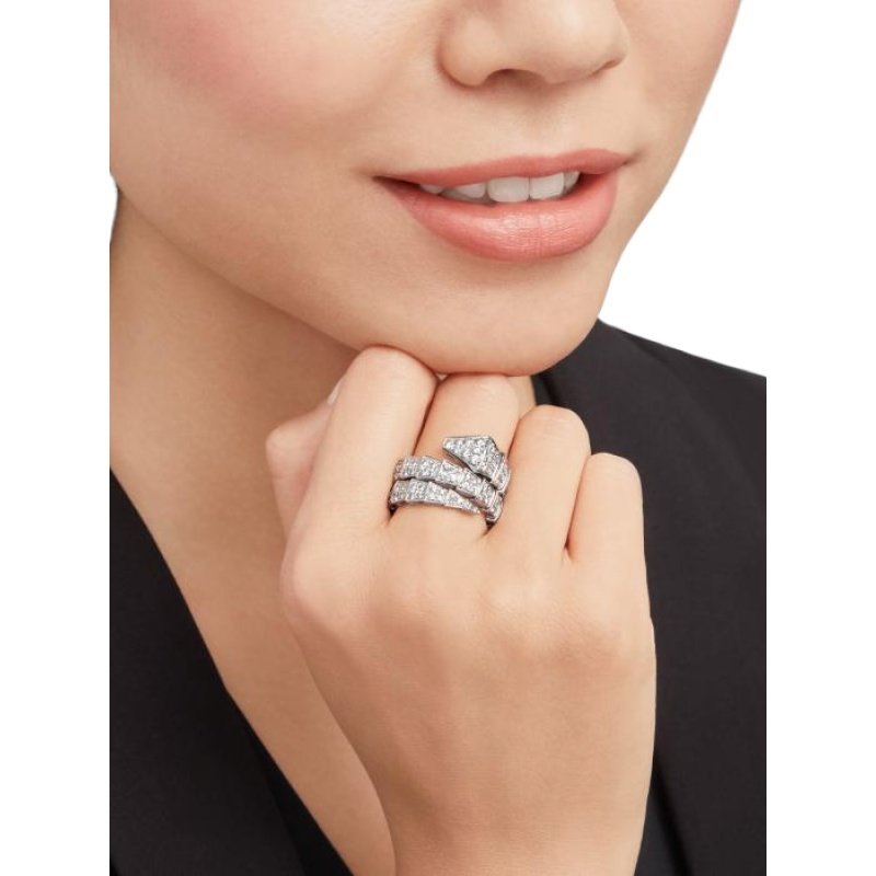 The Serpenti Viper ring in 18K white gold, fully pave-set with diamonds, is a signature style that cleverly combines pure aesthetics, circumferential shapes and charming charm, and simply interprets the endless transformation and evolution of Bvlgari’s classic works. This charming jewelry piece embodies the powerful characteristics of the mysterious snake’s continuous transformation, inspiring people to actively seek change and regard it as an inexhaustible source of strength and confidence. It is suitable for mixing and matching at will, providing a variety of styling options, showing the flexible and versatile style of the series.