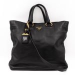A large and charming shopping tote from Prada. Made with black leather with gold-tone hardware. Dual handles and an adjustable shoulder strap. Spacious insides with slim pocket on one side and a large zipper pocket on the other side. Button closure in the middle to keep your items safe.