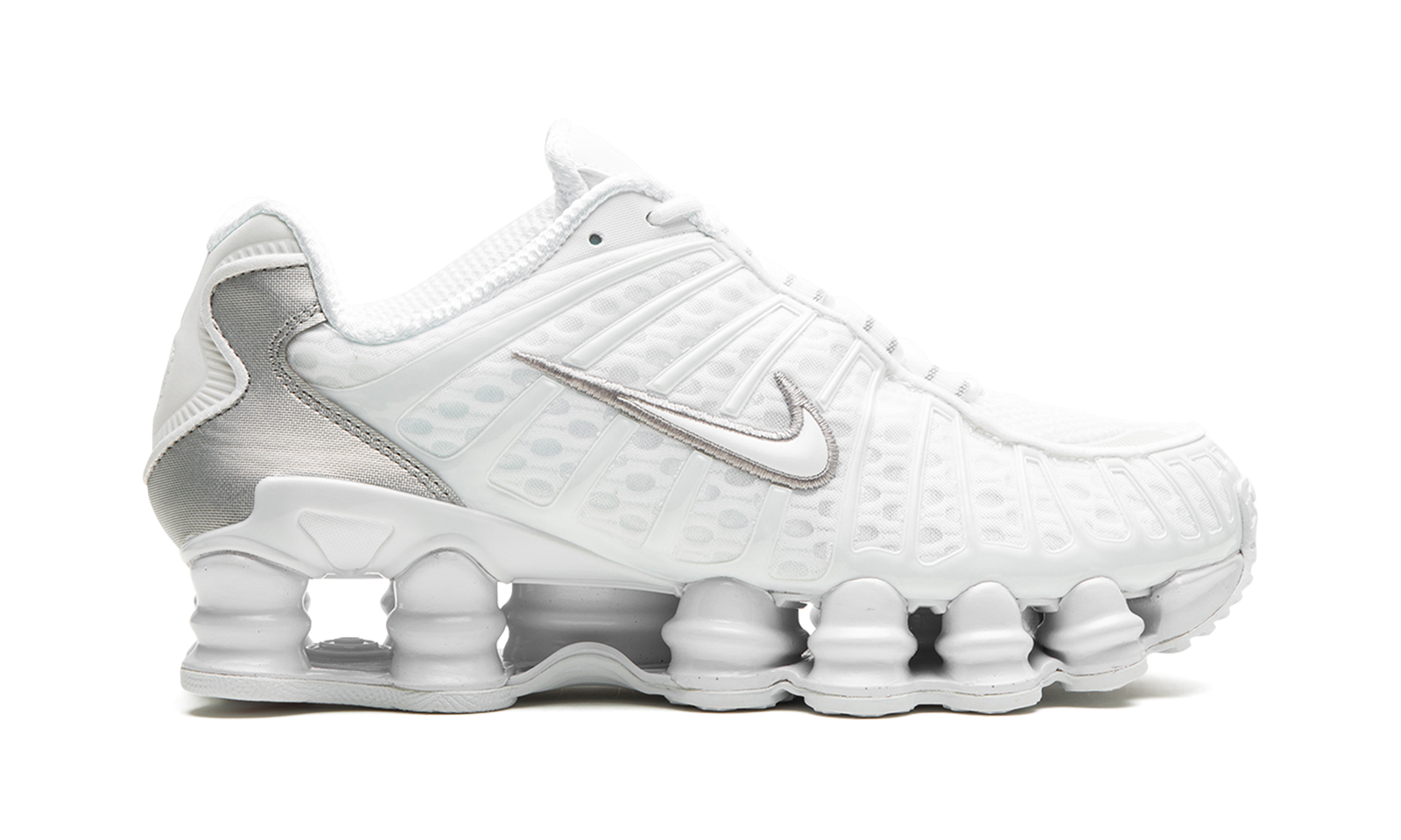 The Women’s Nike Shox TL “White” is the women’s sizing of the retro sneaker in a monochromatic white colorway. The shoe features a white fabric construction with tonal TPU overlays. A white patent leather Swoosh logo appears on either side of the shoe. “Nike Shox” branding is seen on the tongue. Underfoot, the Shox TL’s signature piston-shaped columns underfoot provide both a comfortable and responsive ride, as well as vintage, Y2K-era flair.