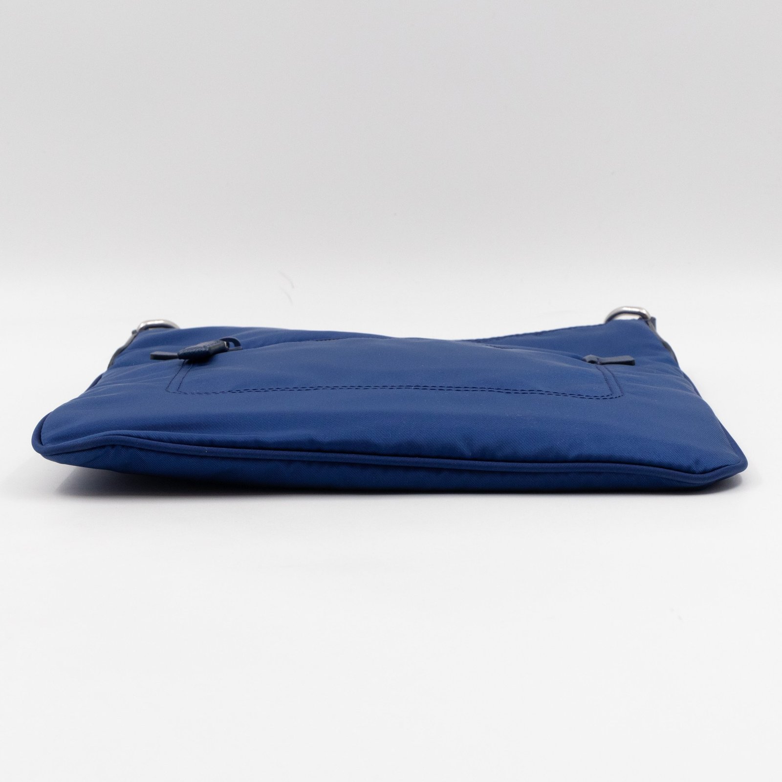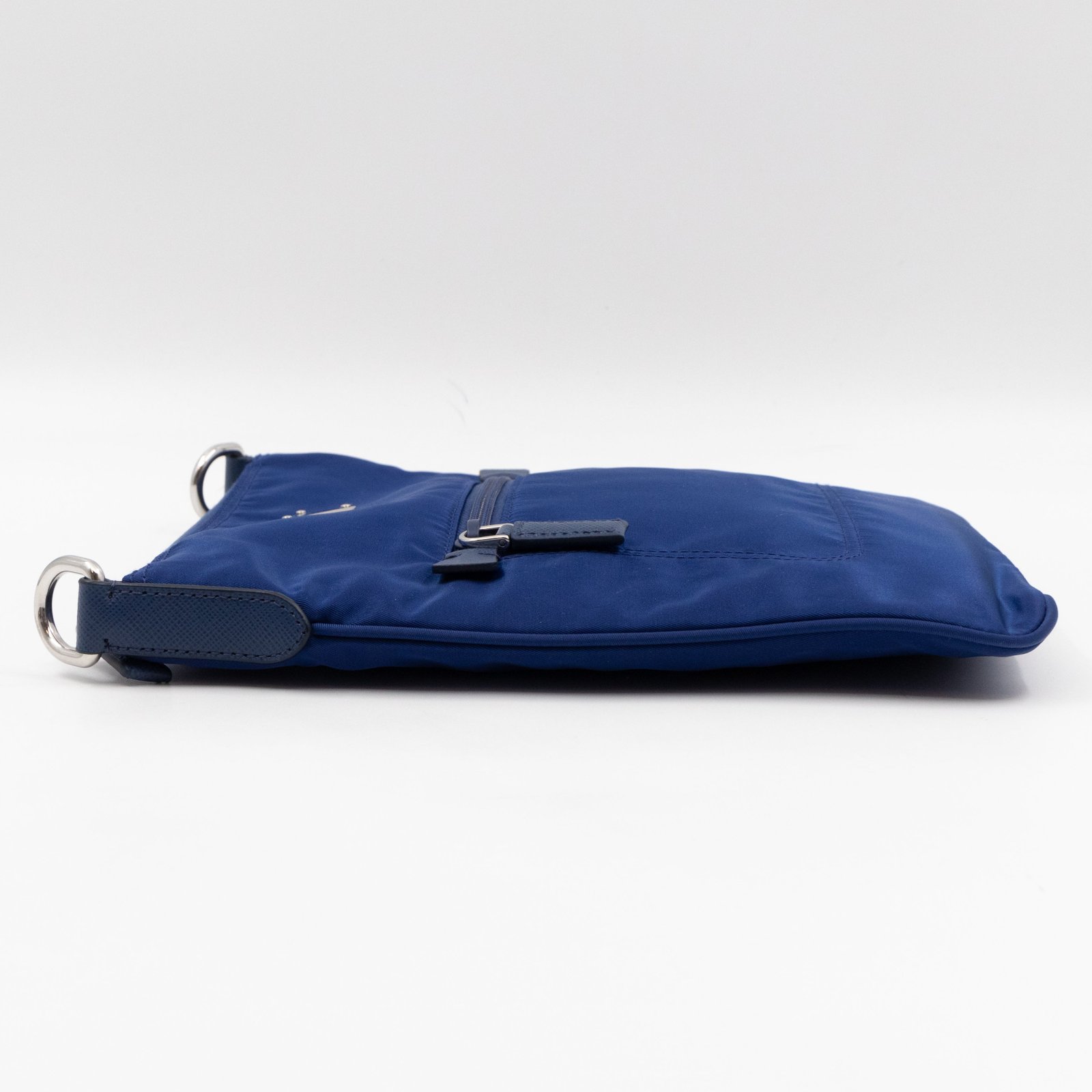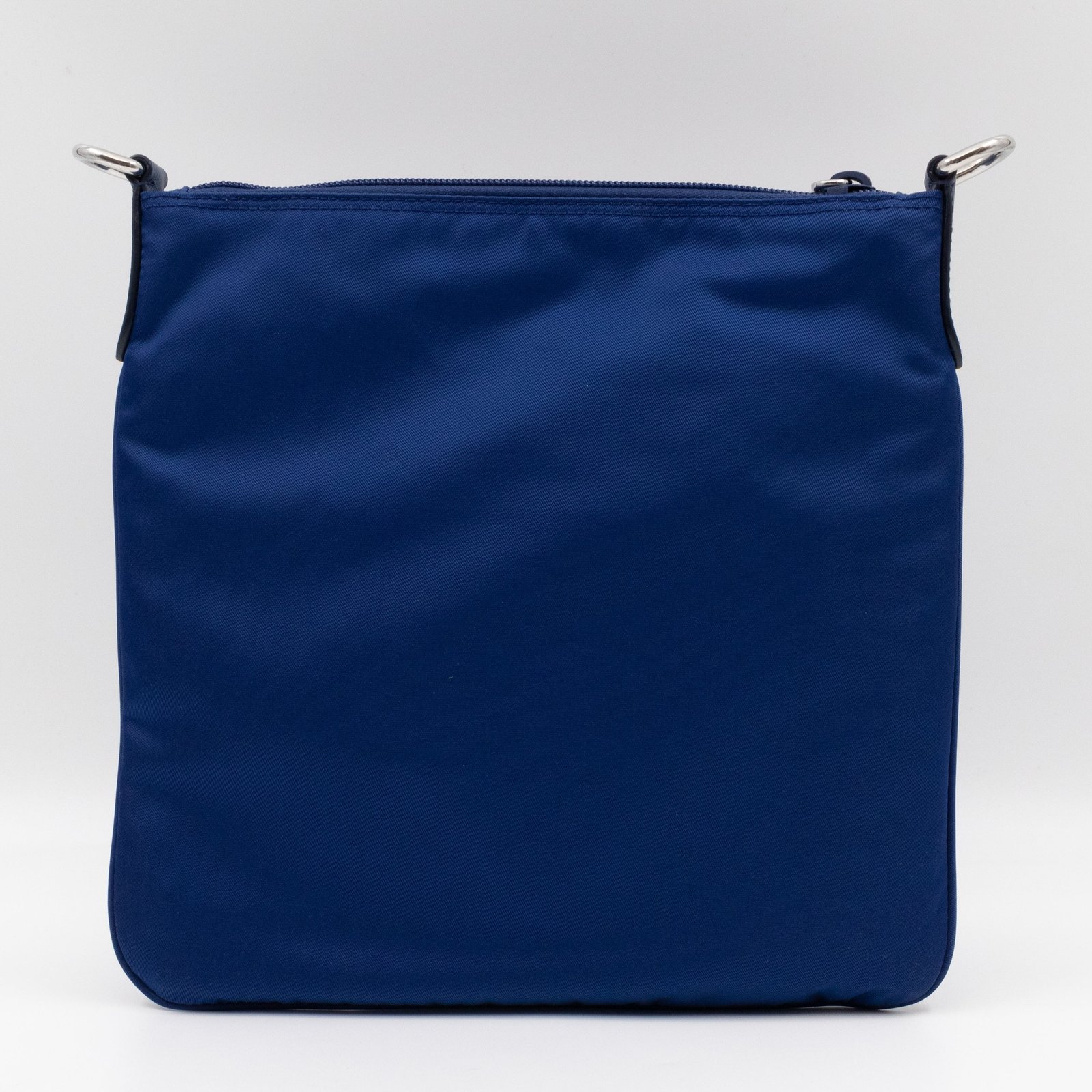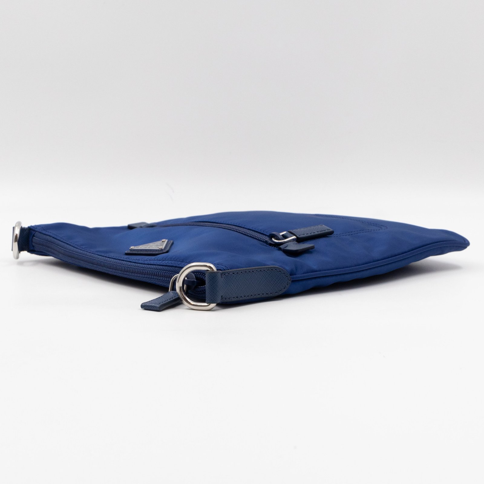 A sporty small crossbody messenger bag by Prada. The classic series tessuto nylon bags have recently returned in popularity. Made with blue tessuto nylon and fabric, combined with matching leather accents and silver-tone hardware. Adjustable crossbody strap for comfortable wear. Slim design with two zipper compartments for ease of use, inside are slim pockets. Great for travel and daily use.
