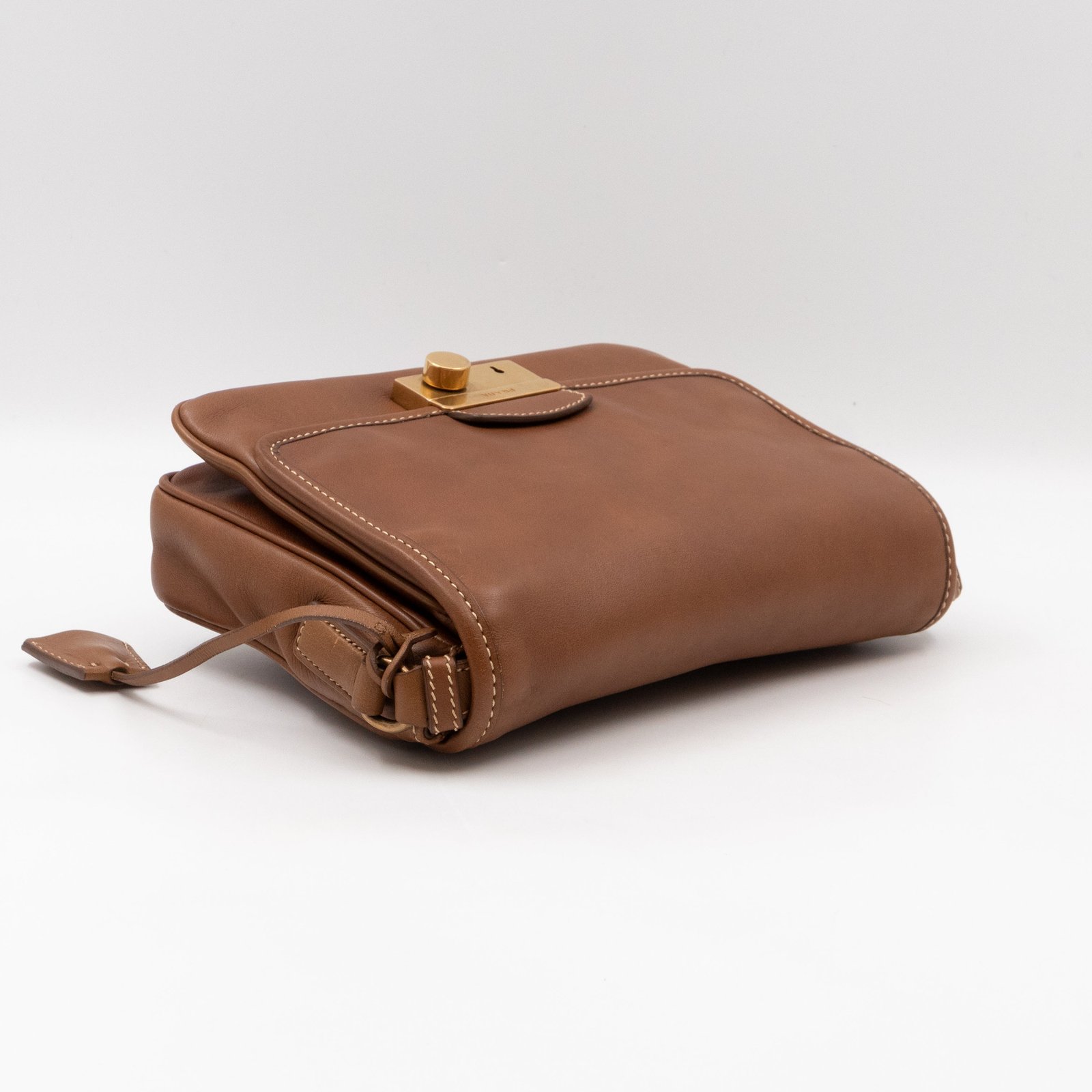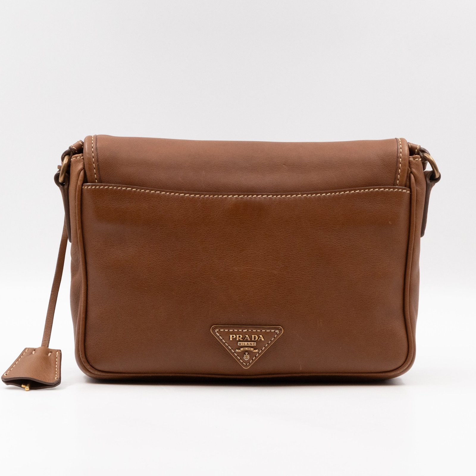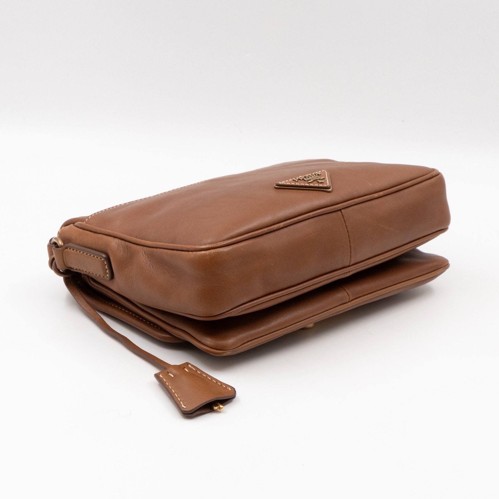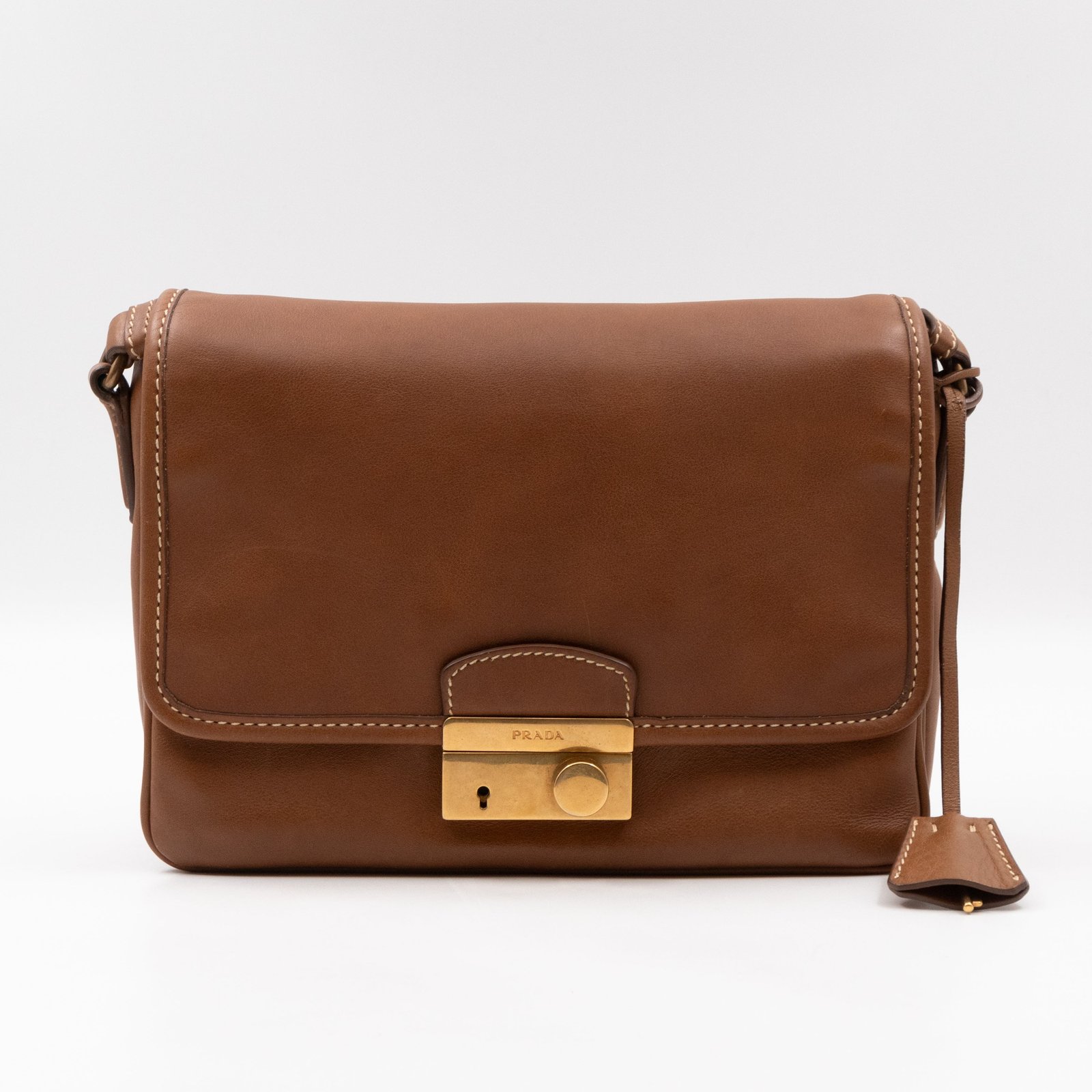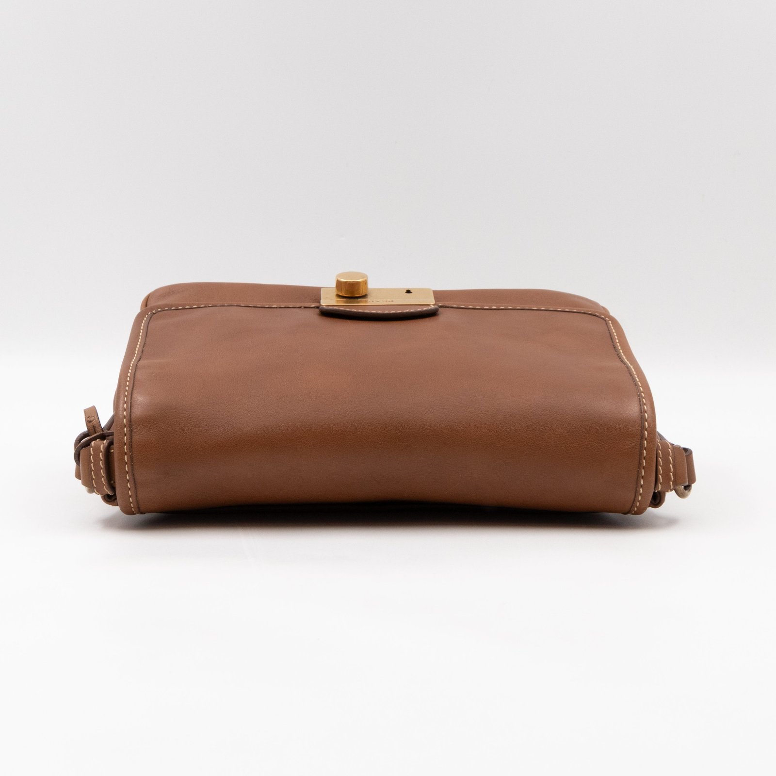 This is a Prada Sound flap crossbody bag. Made in brown leather. The bag features a gold-tone metal press lock and a leather shoulder strap. The flap opens to two compartments and all of which are natural canvas. Shoulder strap can be carried on the shoulder or crossbody.