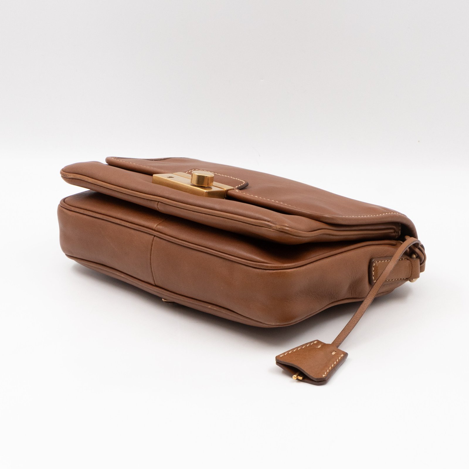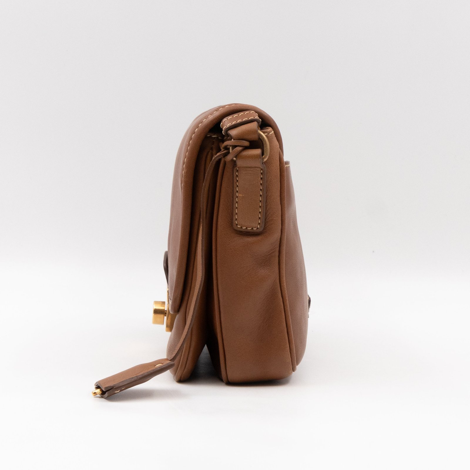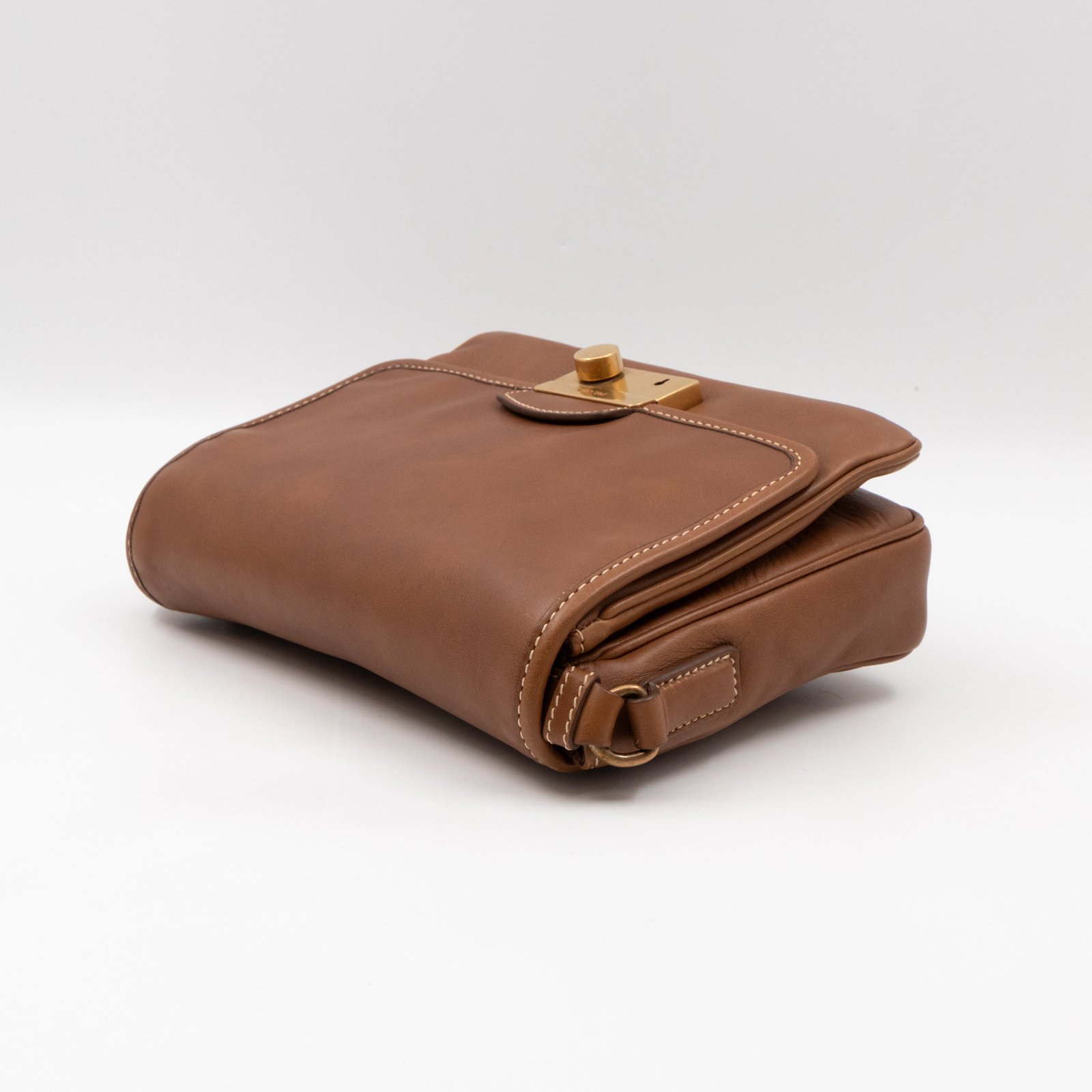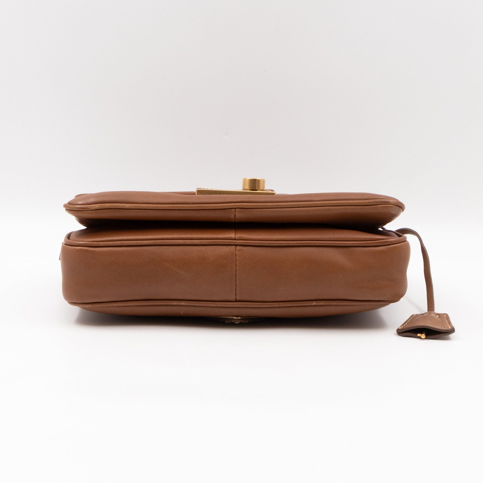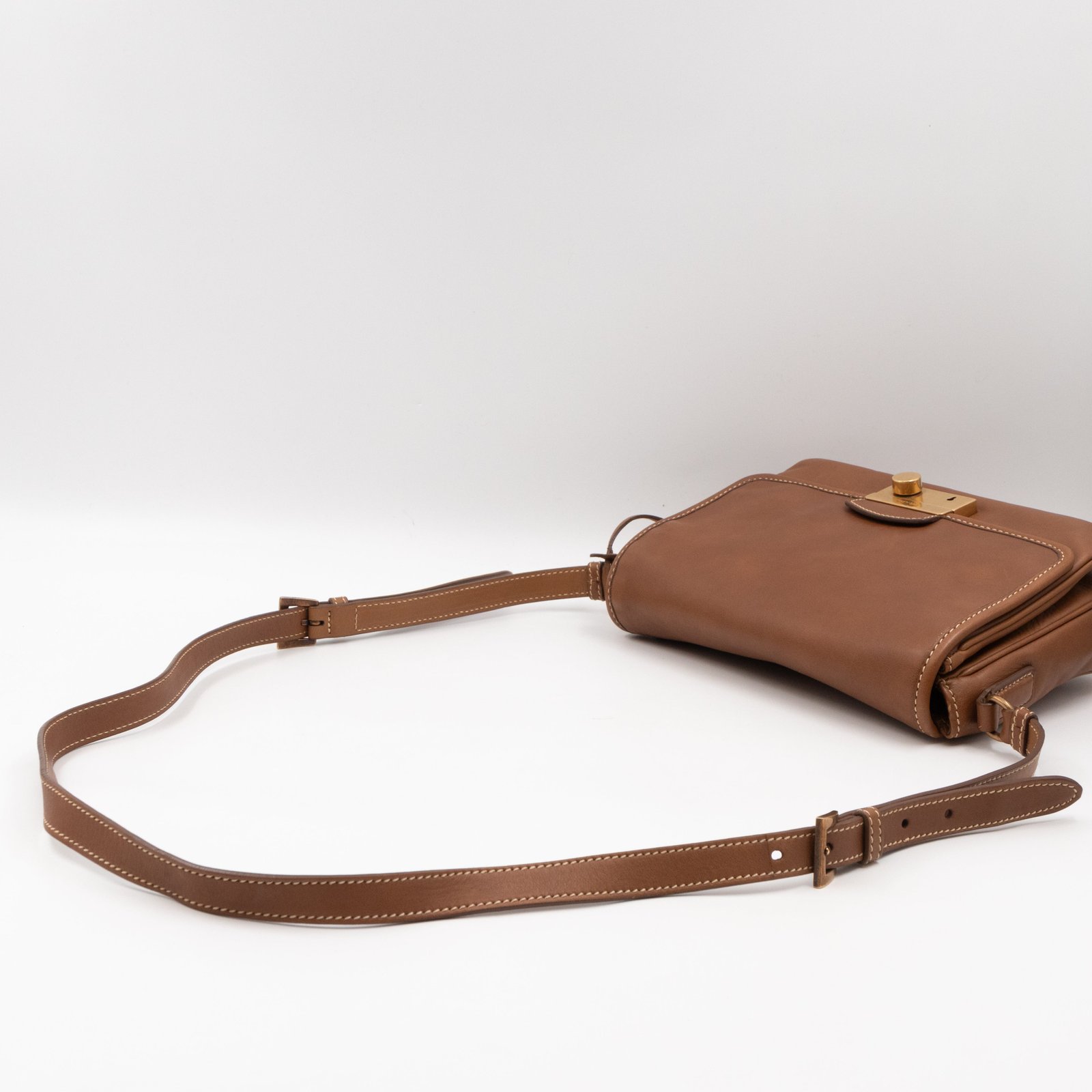 This is a Prada Sound flap crossbody bag. Made in brown leather. The bag features a gold-tone metal press lock and a leather shoulder strap. The flap opens to two compartments and all of which are natural canvas. Shoulder strap can be carried on the shoulder or crossbody.